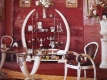 Bestehend aus 4 Stosszähnen in Elfenbeinimitation, die paarweise auf zwei Sockeln aus Edelholz aufgebaut sind in elfenbeinfarben oder sucupira ausgeführt mit unterbrochenen Silberbeschägen auf den Rändern der Sockel.Mit Abschlüssen,Bändern und Kronen auf der Oberseite angereichert und eine Kordeldarstellung, die das Ensemble unten zusammenschnürt, alles versilbert ,patiniert und lackiert.Glasplatte eiförmig und angefast. Maße: 250cm lang,130cm breit, 79cm hoch (Glasplatte) Maße: 88cm lang,36cm tief,77cm hoch (Tischfuss) Der Tischfuss ist auf Anfrage auch einzeln ohne Glasplatte erhältlich. ( 5.000,00 Euro)